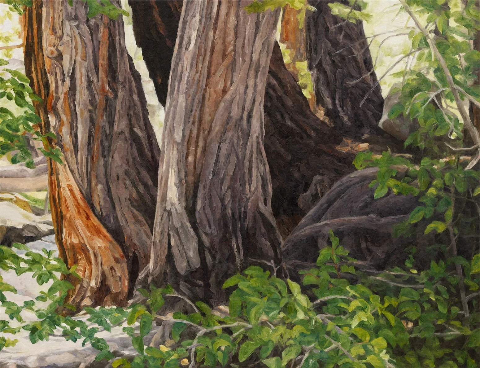 These California tree portraits were created using the traditional materials of oil on linen canvas. Some of the smaller canvases were painted outside, but most begin with numerous tree photos to experiment with compositions. Sketching may also contribute, especially for the paintings where borders appear as the trees are placed in a human context. For a slideshow click on any image below, then visit the Archive to find more information about each painting.